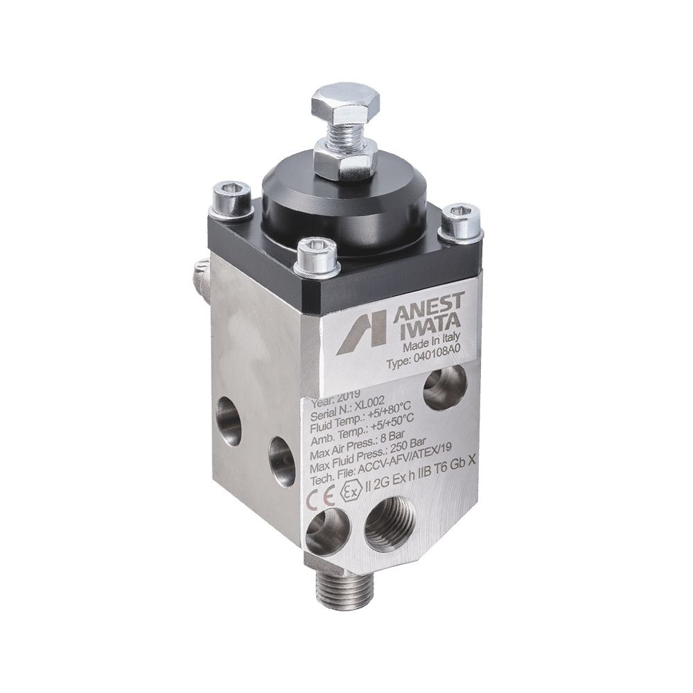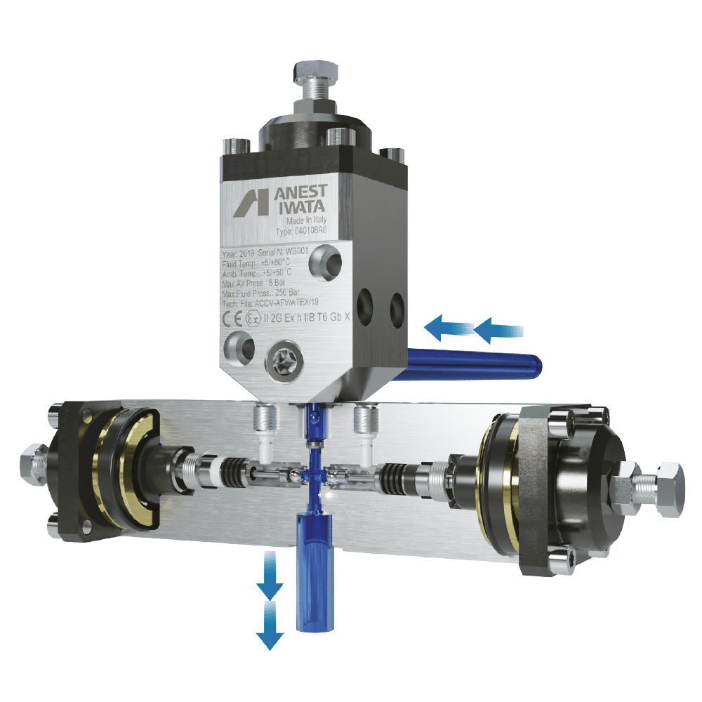 Geringe Steuerluft von nur 4 bar (bis 8 bar) notwendig zum Öffnen der Nadel, Prozesssicherheit bei Schwankungen im Druckluftnetz.