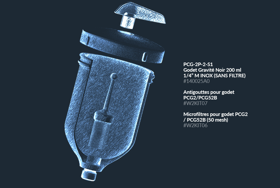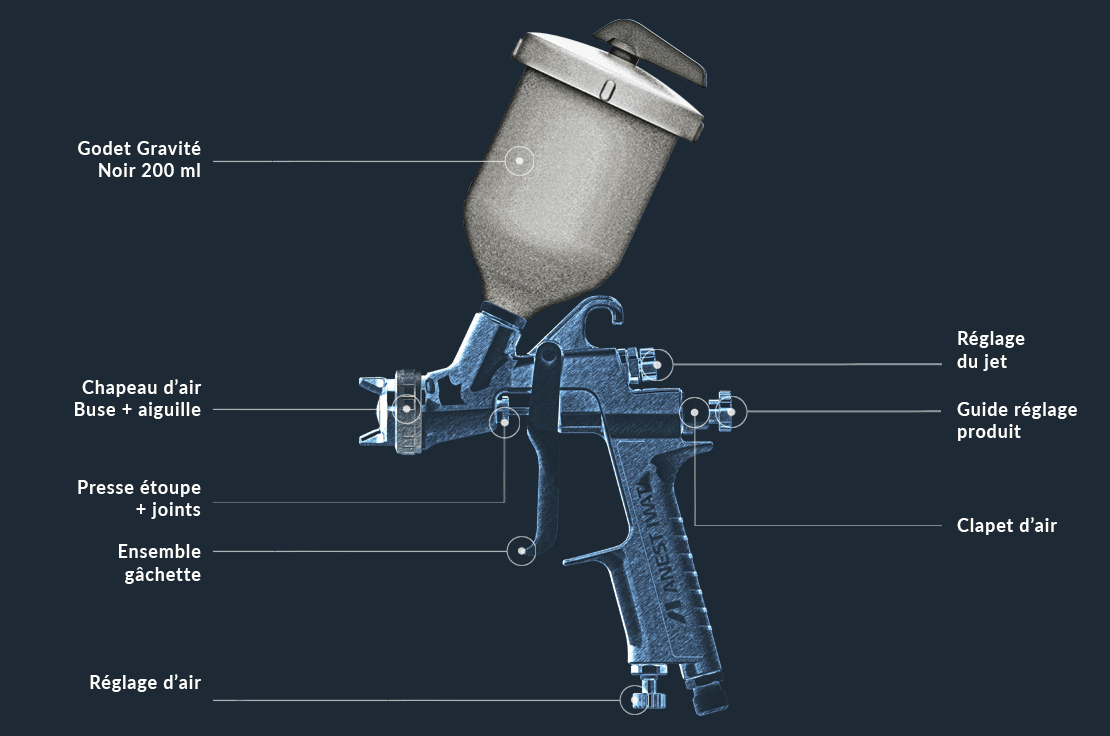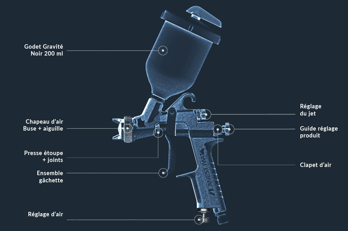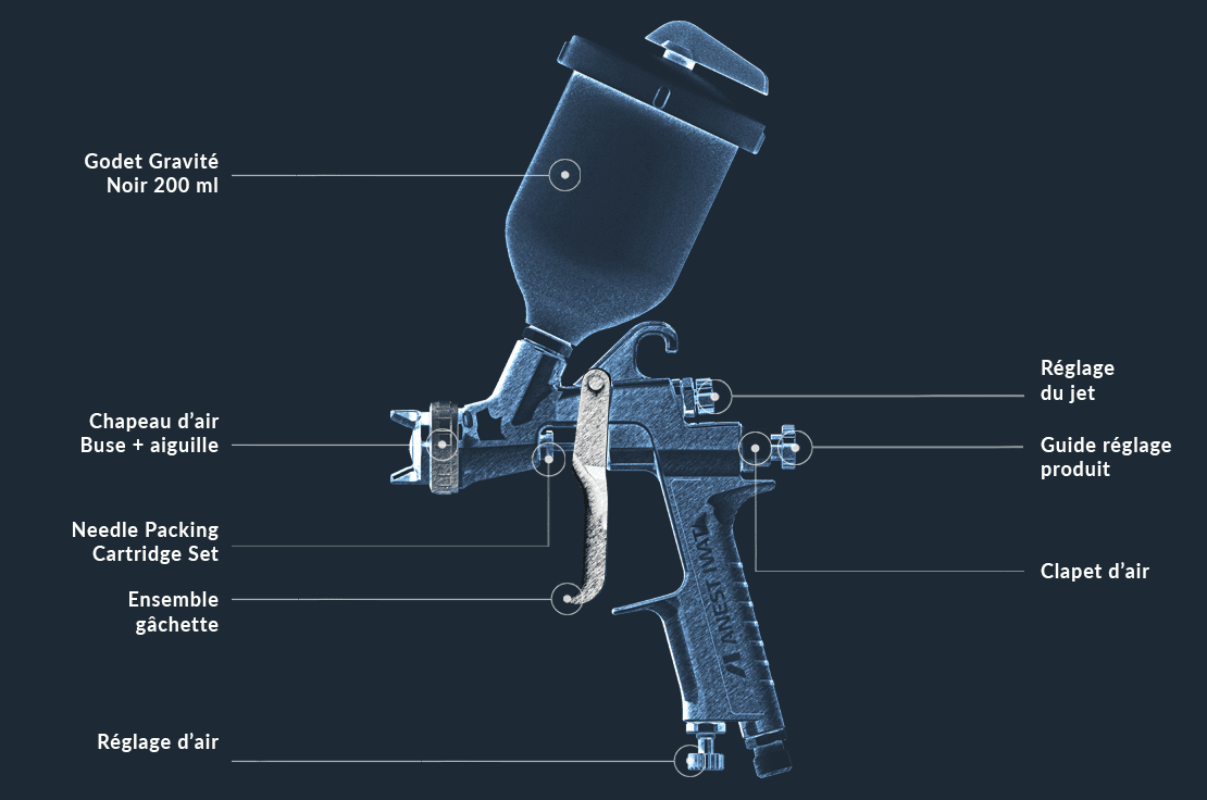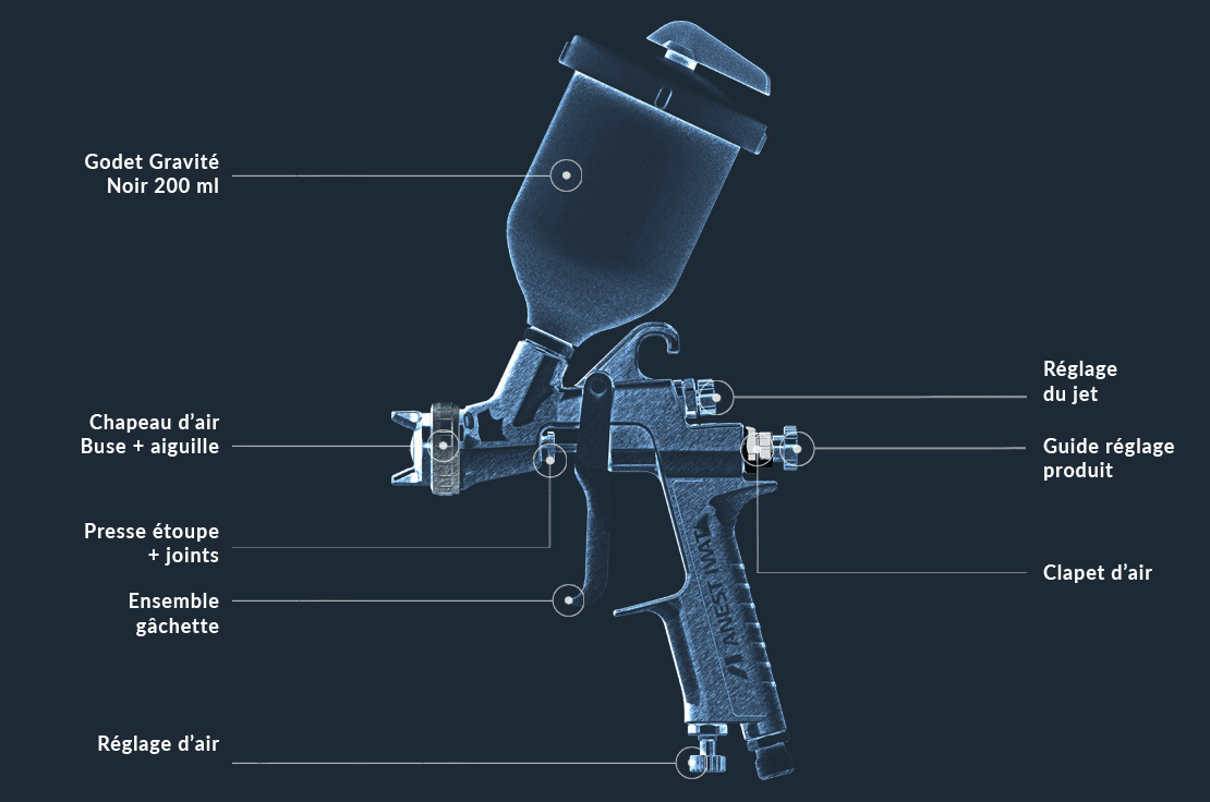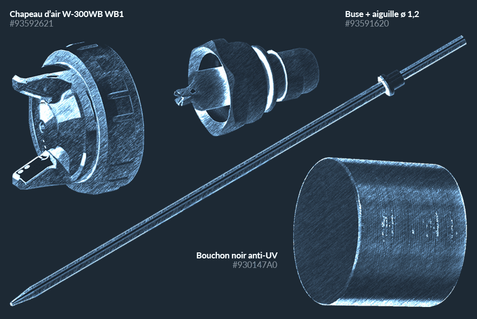 Le W-300 WB UV dispose d'une buse à ailettes. La technologie de pré-atomisation permet un haut taux de transfert. Son bouchon de protection noir anti-UV empêche la peinture de sécher.