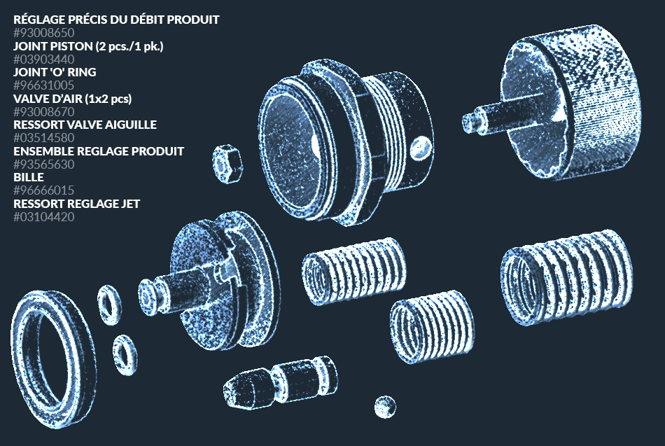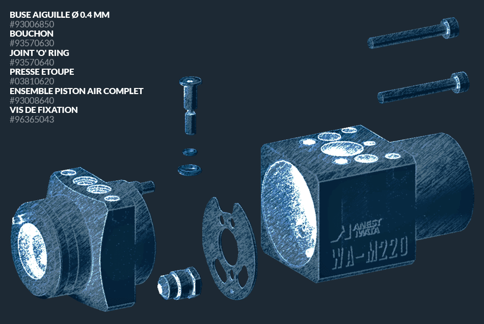 Le WA-M 220 est équipé d'un piston 3 branches éliminant l'installation de 3 électrovannes pour la synchronisation de l'air de corne, de l'air de centre et du débit produit. Une seule électrovanne est nécessaire pour le contrôle complet du pistolet.