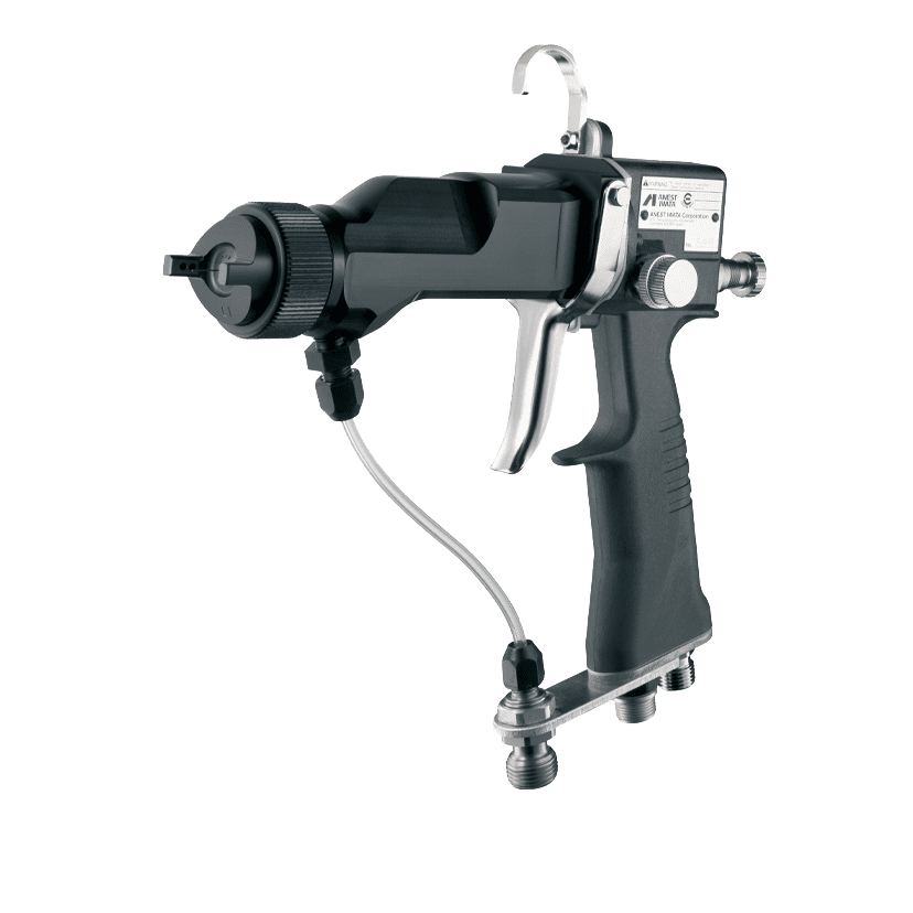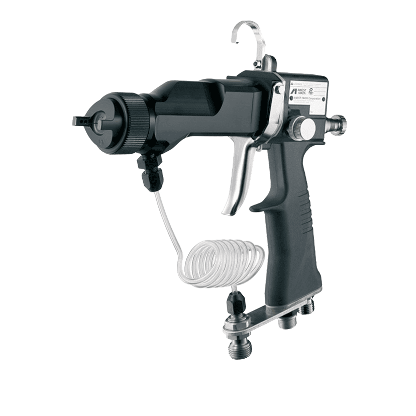 L'apparecchiatura elettrostatica Anest Iwata combina le caratteristiche specifiche della tecnologia di verniciatura elettrostatica con l'atomizzazione del sistema HVLP per un trasferimento ottimale del materiale.